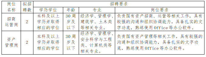 为满足公司发展需要,加强人才梯队建设,现面向优秀应届毕业生招聘2个岗位共4名员工,其中招商运营岗2名、资产管理岗2名。有关事项公告如下: